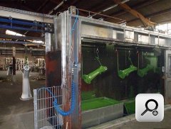 Seit dem 23.04.2012 ist unsere neue Grundierungsanlage in Betrieb. Die Grundierung erfolgt mit wasserlöslichen Farben. Angefangen hat man mit der Farbe Grün, wobei kurzfristig auch die Farbe Schwarz verwendet werden soll. In der Anlage können täglich bis zu 700 Tonnen Guss grundiert werden, wobei die Anhängelast pro Teil 220 kg beträgt.