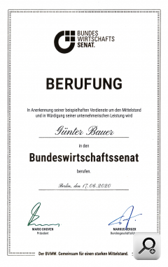 Jahrelange harte Arbeit, Leidenschaft, Pflichtgefühl, Mut und stetiger Fleiß zeichnen unseren Geschäftsführer Günter Bauer aus. Pünktlich zum 30-jährigen Firmenjubiläum erfolgt nun die Berufung unseres Geschäftsführers in den Bundeswirtschaftssenat, durch den Bundesverband mittelständische Wirtschaft (BVMW).